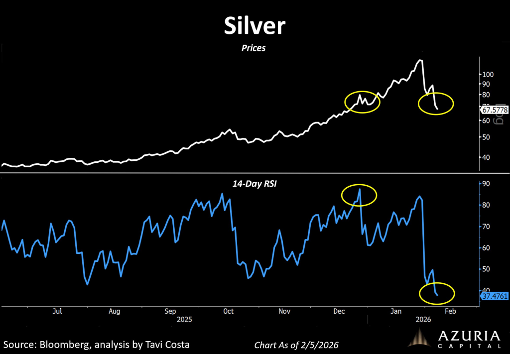 في منتصف ديسمبر، كانت الفضة تتداول بالقرب من 65 دولارًا وكان الشعور شبه مبتهج. كانت الزخم قويًا، والمشترين كانوا عدوانيين، والتحليل الفني كان يعكس ذلك. يلاحظ كوستا أن مؤشر القوة النسبية لمدة 14 يومًا كان يقترب من 80، وهو مستوى يُعتبر عادة مفرط في الشراء.