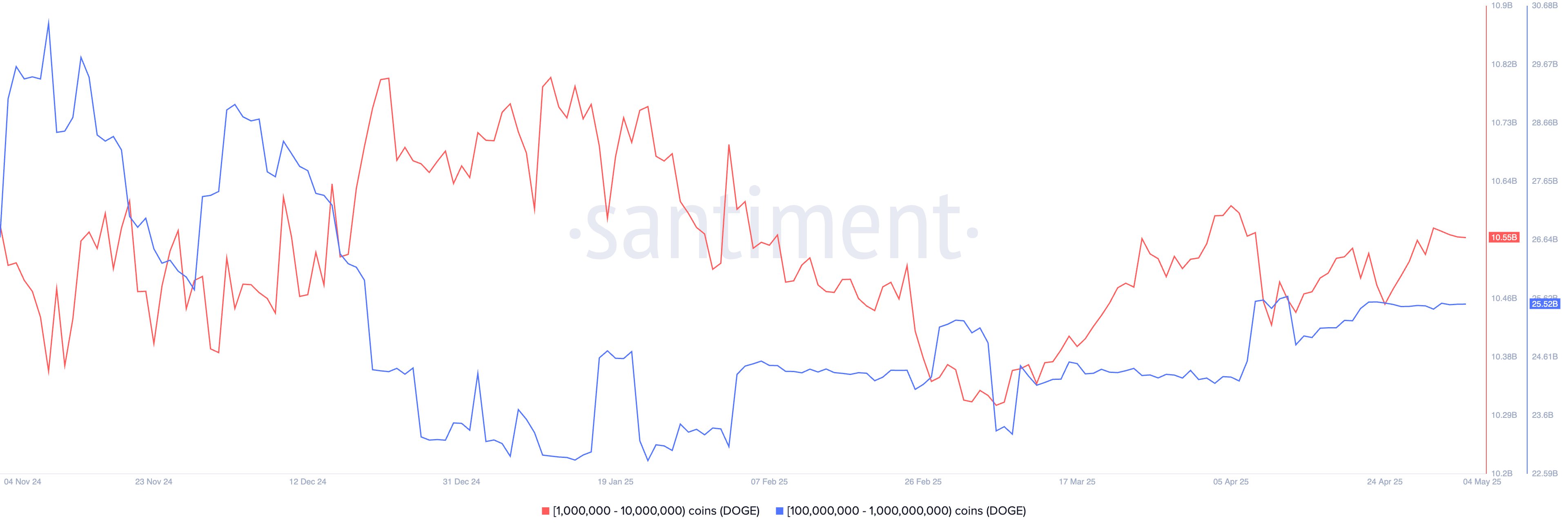 تظهر البيانات داخل السلسلة التي تم تجميعها بواسطة Santiment أن المستثمرين الكبار قد استمروا في تجميع العملة. لقد زادت حيازات حاملي DOGE الذين يمتلكون ما بين 1 مليون و 10 ملايين عملة من 10.3 مليار في مارس إلى 10.5 مليار اليوم، بزيادة قدرها 200 مليون.