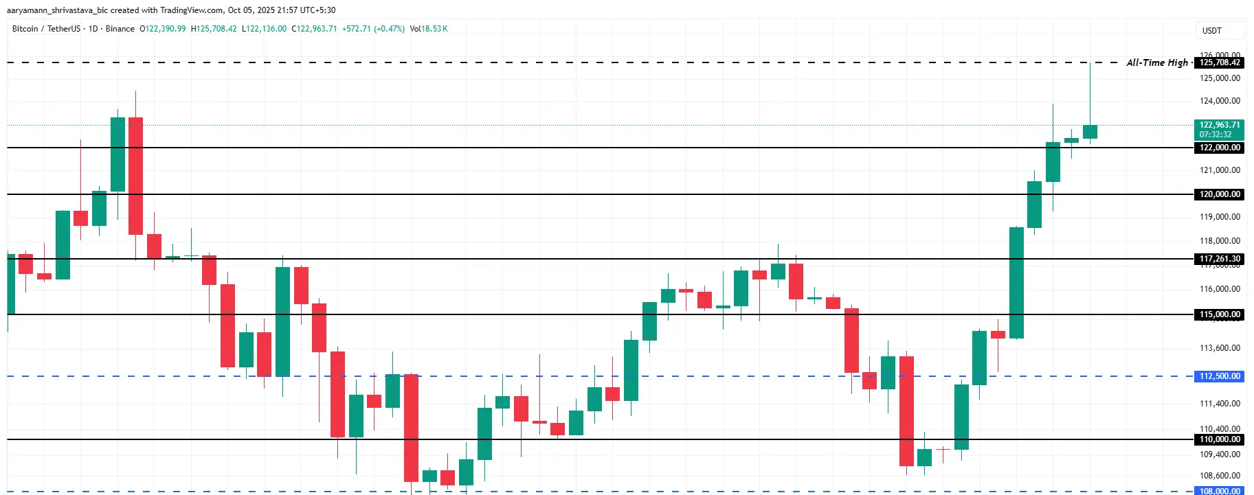 وصل سعر البيتكوين إلى أعلى مستوى له على الإطلاق عند 125,708 دولار قبل أن يستقر بالقرب من 122,963 دولار. يبدو أن هذا الانخفاض صحي بالنظر إلى حجم المكاسب الأخيرة. يبقى الاحتفاظ فوق 122,000 دولار أمرًا حاسمًا للحفاظ على الزخم.