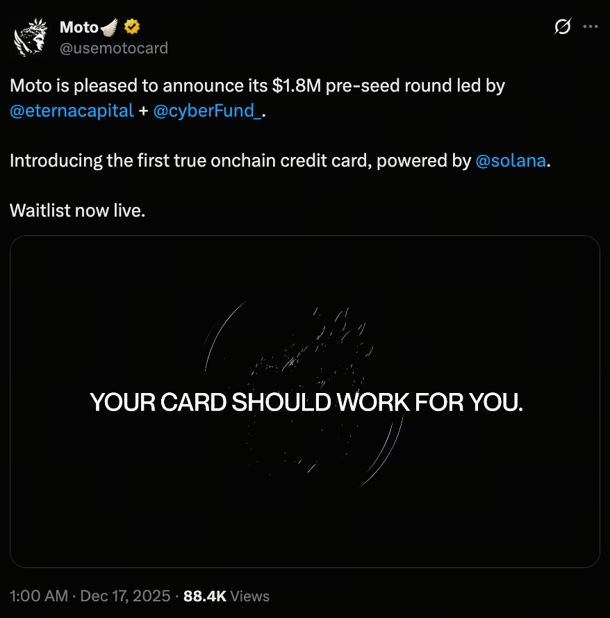 Moto, proyecto de tarjeta de crédito on-chain, ha anunciado recientemente la obtención de 1,8 millones de dólares en una ronda pre-semilla, liderada conjuntamente por Eterna Capital y cyber•Fund, con el respaldo de varios inversores ángel reconocidos del sector cripto.