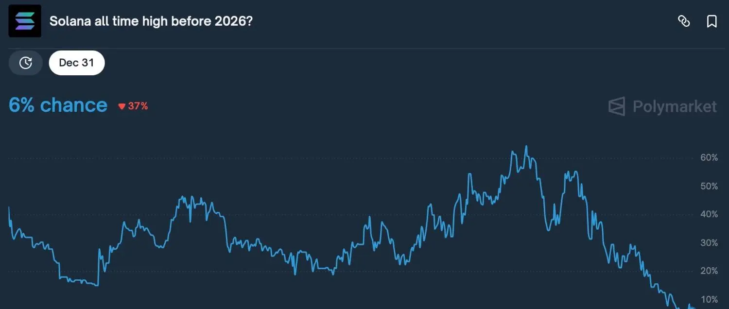 De hecho, el mercado cree que solo hay un 6% de probabilidad de un nuevo ATH de SOL para el 31 de diciembre, según el sitio web de predicciones basado en criptomonedas Polymarket.