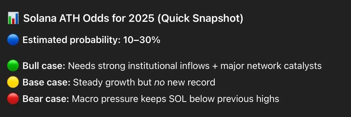 En consecuencia, aunque siempre existe la posibilidad de una reversión brusca del sentimiento, basándose en las tendencias actuales de liquidez, los flujos de ETF y la posición técnica, el modelo de IA asigna una probabilidad del 10-30% de que Solana recupere su máximo histórico en 2025, un escenario que clasifica como “posible pero no el resultado más probable.”