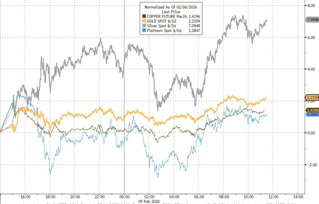 Los metales en general subieron, con la plata liderando con un aumento de más del 7%. El oro en spot continuó la tendencia de rebote de la semana pasada, subiendo más del 2.3% en el día y superando los 5000 dólares.