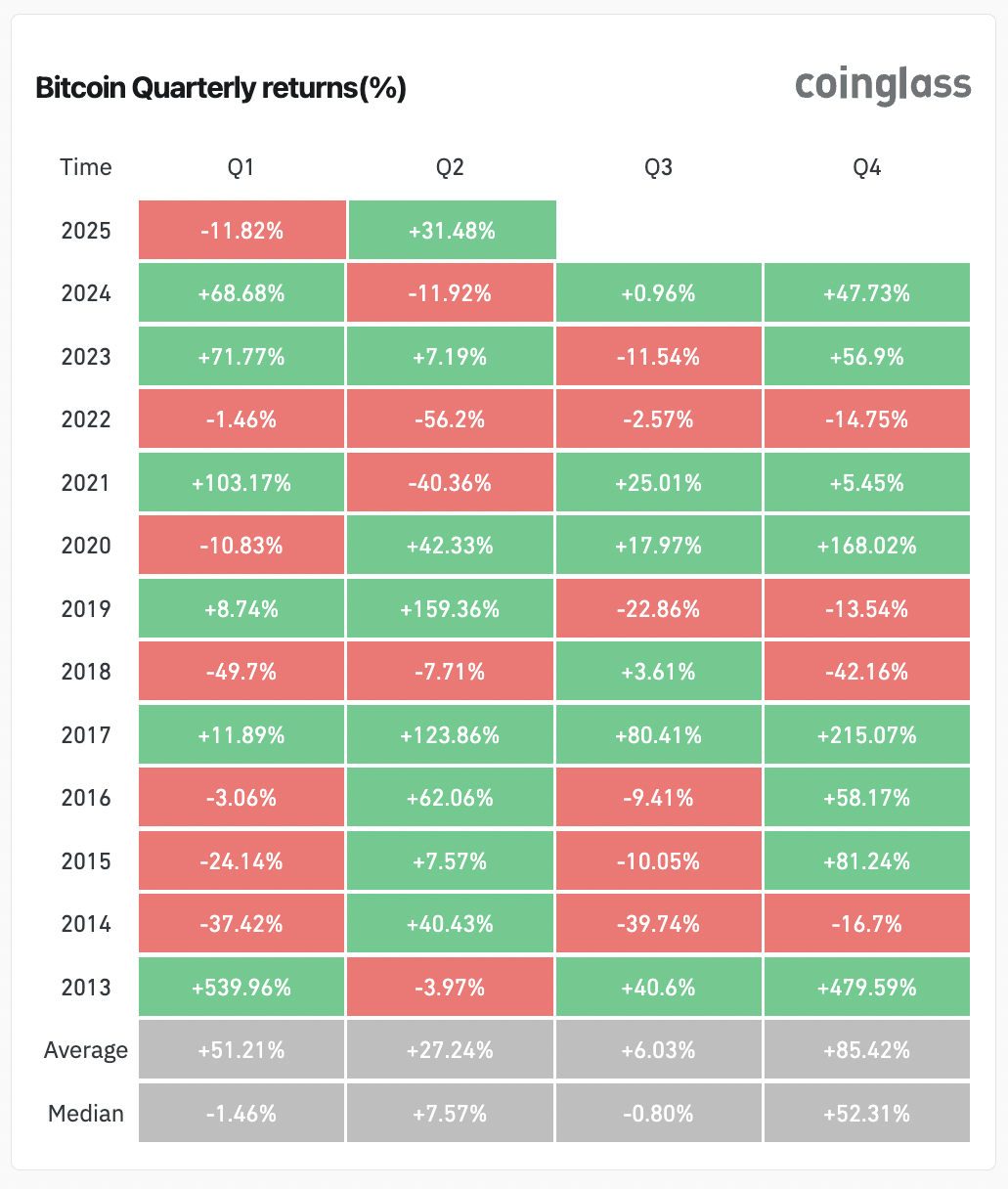 Selon les données de CoinGlass, le troisième trimestre est en moyenne le trimestre le plus mauvais pour Bitcoin depuis 2013, avec un taux de rendement moyen de seulement 6,03 % au cours des 11 dernières années. Le deuxième trimestre est le deuxième trimestre en termes de rendement moyen, mais historiquement, le rendement moyen du deuxième trimestre est plus élevé, atteignant 27,25 %.