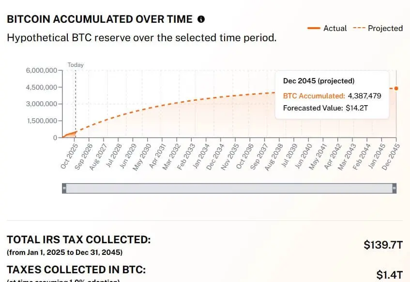 L'Institut des politiques Bitcoin a soutenu la législation et a publié un modèle montrant comment les paiements d'impôts en Bitcoin pourraient constituer une réserve importante grâce à des flux annuels réguliers.
