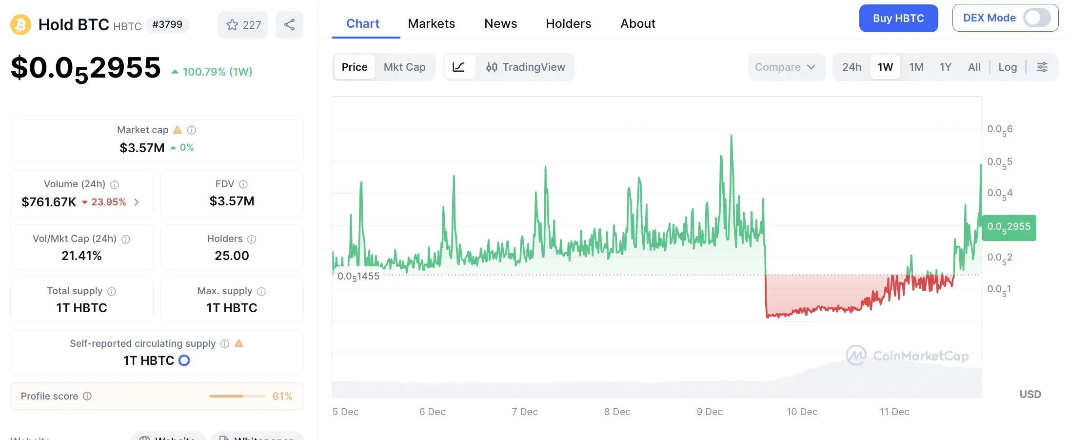 2. Hold BTC (HBTC) — En hausse de 214 % en 24 heures, Surprise de l’Écosystème Meme