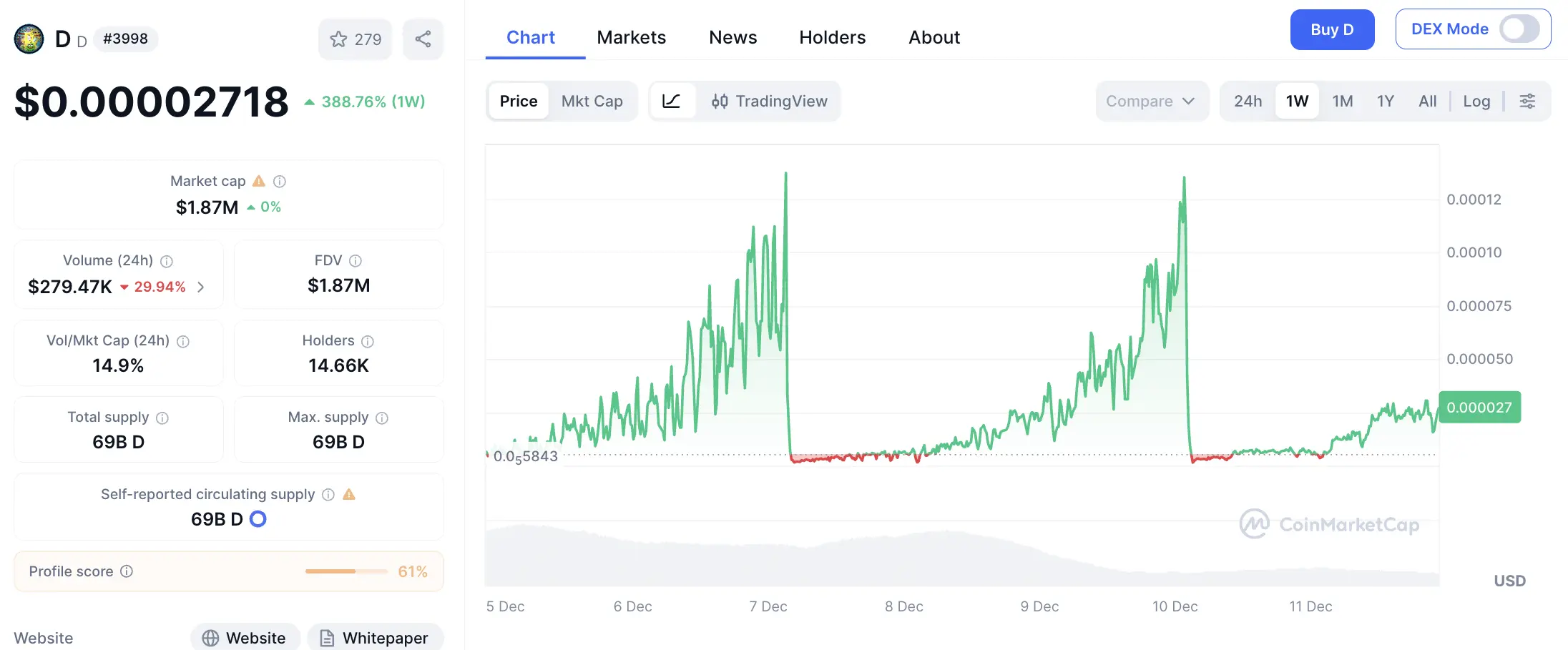 Le token D a connu une hausse extraordinaire avec une augmentation de 478,64 % au cours des sept derniers jours. Le prix du token a grimpé à US$0,00002718, tandis que la capitalisation boursière atteignait US$1,68 million.
