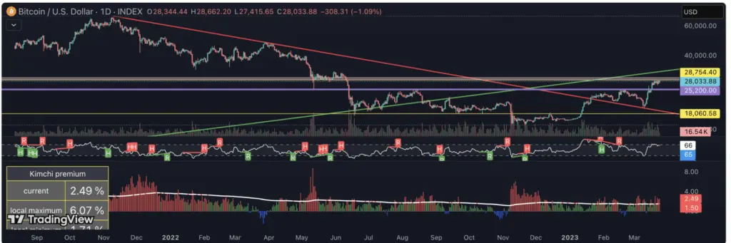 Lorsque la prime kimchi dépasse 1,5 %, cela s’aligne généralement avec une tendance haussière du prix du Bitcoin, même lors de périodes où les prix mondiaux ne montaient pas particulièrement. Les données historiques suggèrent que lorsque la prime est élevée, elle est souvent corrélée à une rupture des niveaux de résistance clés du Bitcoin. Le niveau de résistance actuel pour le Bitcoin est d’environ 28 754,40 $, tandis qu’un support solide se trouve à 25 200 $. Ce niveau de support correspond au pic de volume d’achat le plus élevé, coïncidant avec la hausse de la prime kimchi en Corée.