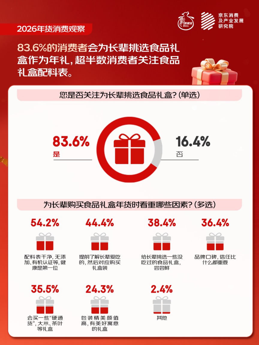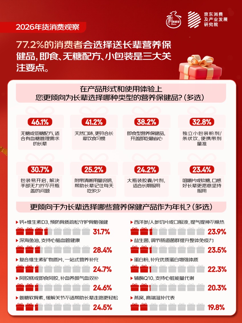 Le Nouvel An approche, l’atmosphère festive s’intensifie, et la consommation de produits de fête est à la fois un feu d’artifice humain et une fenêtre importante pour observer la vitalité de la consommation et les changements d’époque. Le Journal des Valeurs·Data Treasure, en partenariat avec l’Institut de Recherche sur la Consommation et le Développement Industriel de JD.com, lance en grande pompe la série « Observation de la consommation des produits de fête en 2026 », présentant de nouveaux changements et tendances de consommation dans une ambiance festive, explorant la logique industrielle et la valeur d’investissement derrière, et partageant avec les lecteurs une année chinoise en pleine effervescence. Cet article concerne la section des cadeaux pour les aînés.