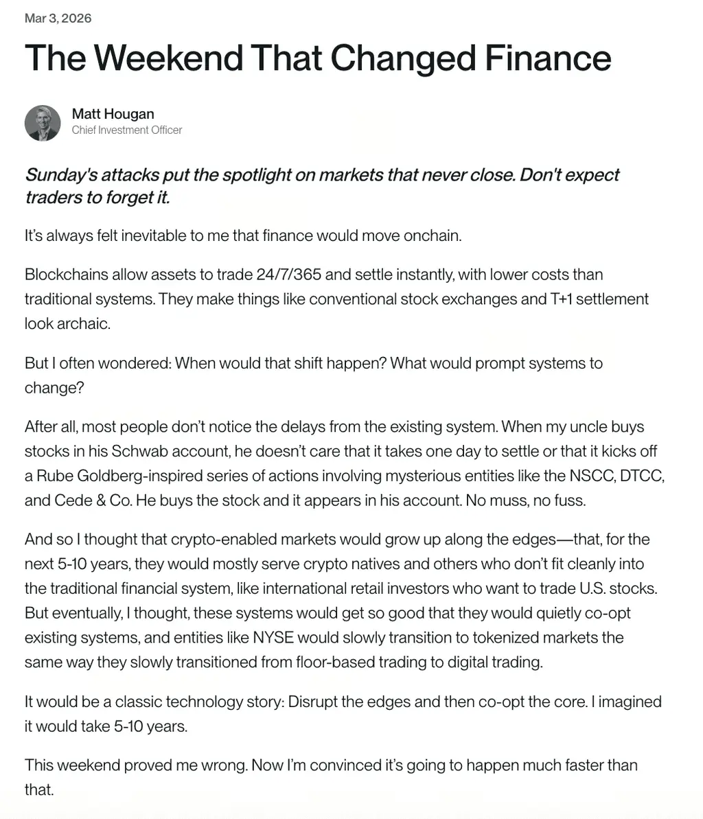 Le 2 mars 2026, Matt Hougan, directeur des investissements chez Bitwise, a publié un mémorandum intitulé « Le week-end qui a changé la finance », soulignant que l’attaque militaire des États-Unis contre l’Iran la semaine précédente avait permis au marché basé sur la cryptographie de jouer pour la première fois un rôle principal dans la découverte des prix mondiaux. Hougan a affirmé que cet événement démontrait l’indispensabilité des systèmes financiers on-chain, fonctionnant 24/7, pour faire face aux crises mondiales. Il estime que, désormais, les fonds spéculatifs, banques et autres institutions de trading professionnelles n’ont plus le choix quant à l’utilisation des outils financiers on-chain, ce qui accélérera considérablement la migration du secteur financier traditionnel vers une infrastructure cryptographique.