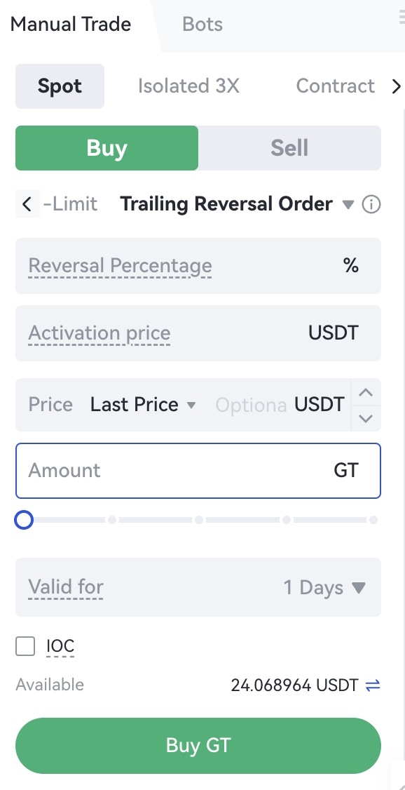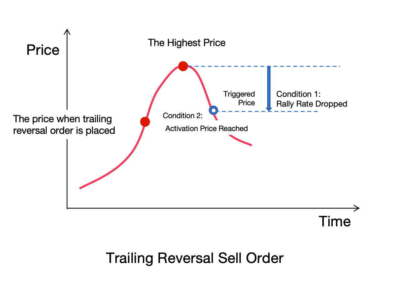 追蹤訂單是針對市場行情回調自動執行的策略訂單,用戶可以設置回調幅度和激活價格(選填),當設置的條件滿足後,就會觸發該訂單以設置的委託價和委託量下單委託。