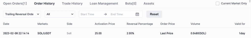 追蹤訂單可以選擇設置1-7天、15天和30天的有效期,在有效期內,系統都會自動監測價格變動情況進行觸發下單,有效期結束後,沒有觸發的追蹤訂單會自動撤銷。