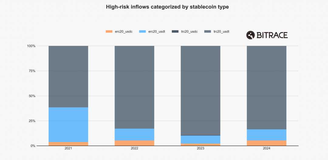 Mengingat bahwa aktivitas berisiko terutama terjadi di jaringan Ethereum dan Tron, Bitrace mendefinisikan alamat blockchain yang digunakan oleh entitas ilegal di kedua jaringan ini untuk menerima, mentransfer, dan menyimpan stablecoin (erc20_usdt, erc20_usdc, trc20_usdt, trc20_usdc) sebagai alamat berisiko tinggi. Dalam 2024 lalu, total volume penerimaan alamat berisiko tinggi ini mencapai 6490 miliar dolar, sedikit lebih tinggi dibandingkan tahun lalu.