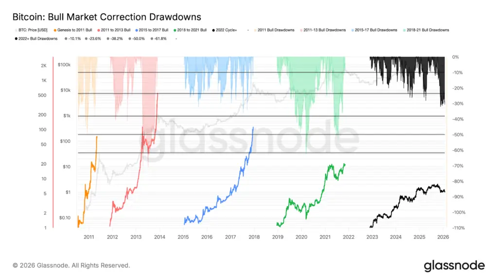 Koreksi pasar bullish Bitcoin atau penurunan harga bukanlah fenomena yang jarang terjadi. Faktanya, ketika kita melihat sejarah, koreksi saat ini sekitar 30% dari puncak yang dicapai pada Oktober tahun lalu berada dalam rentang koreksi siklus bull sebelumnya. Kami bahkan pernah melihat koreksi yang lebih tajam seperti dalam siklus bull 2021 sebelum tren naik akhirnya dilanjutkan