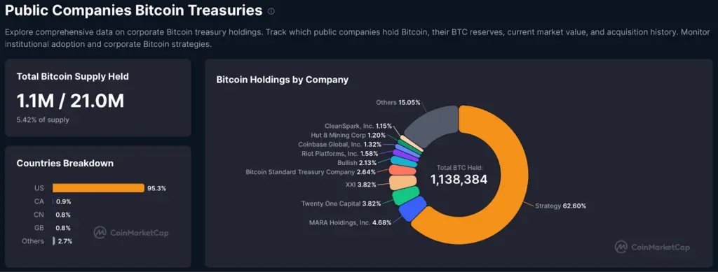 Pada saat yang sama, perusahaan treasury Bitcoin publik yang masuk ke dalam permainan telah menambahkan lapisan struktural baru ke dinamika pasokan Bitcoin. Mereka kini secara kolektif memiliki 5,42% dari total pasokan
