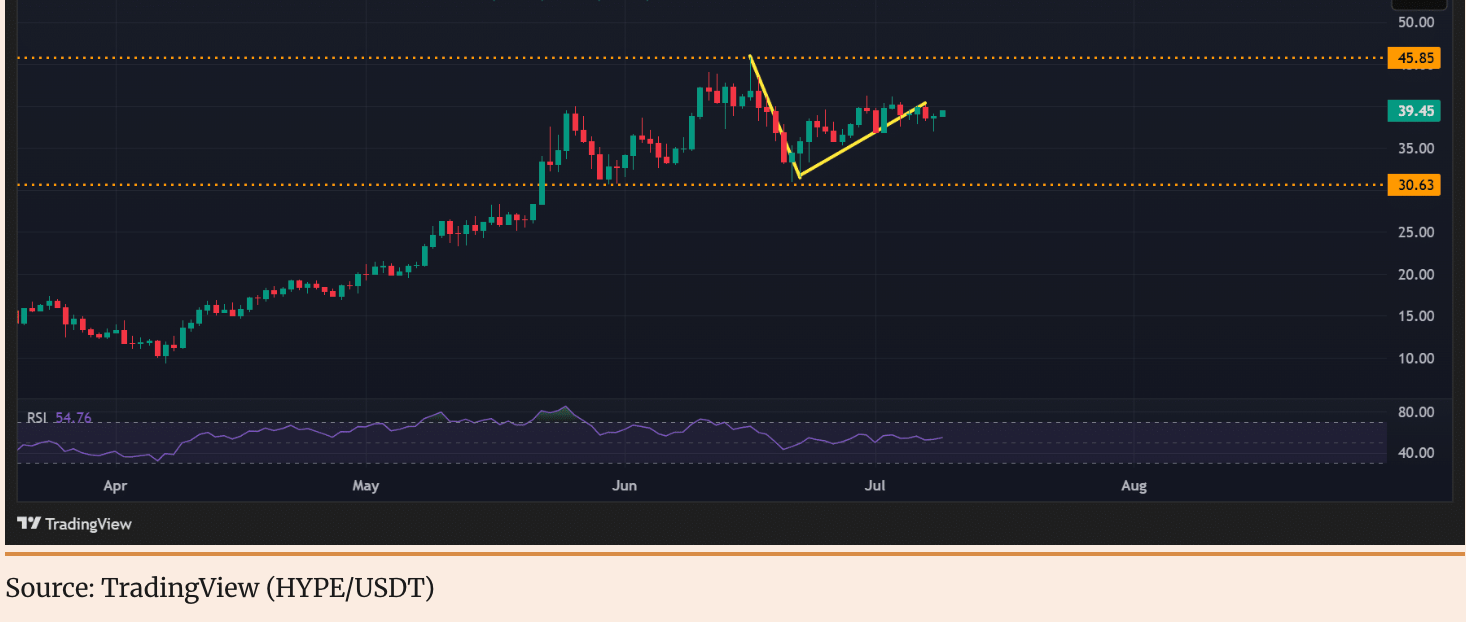 Hyperliquidは第2四半期に200%を超える上昇を達成し、最高で$45に達した後、30%の調整を行いました。このプロセスはクラシックな利益確定パターンを示しています。