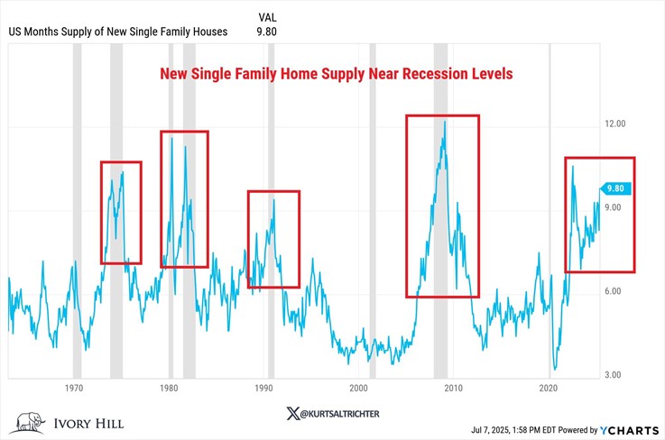 彼が指しているのは「新築一戸建て住宅の月間供給量」で、現在は9.8に達しています。アルトリヒトは「歴史的に見て、このような高水準は経済の不況期または不況の前兆の時にのみ現れます」と述べました。これは、建設業者が高騰する価格だけでなく、需要が蒸発する問題にも直面していることを意味します。不動産市場の疲弊の兆候はますます明らかになっています。