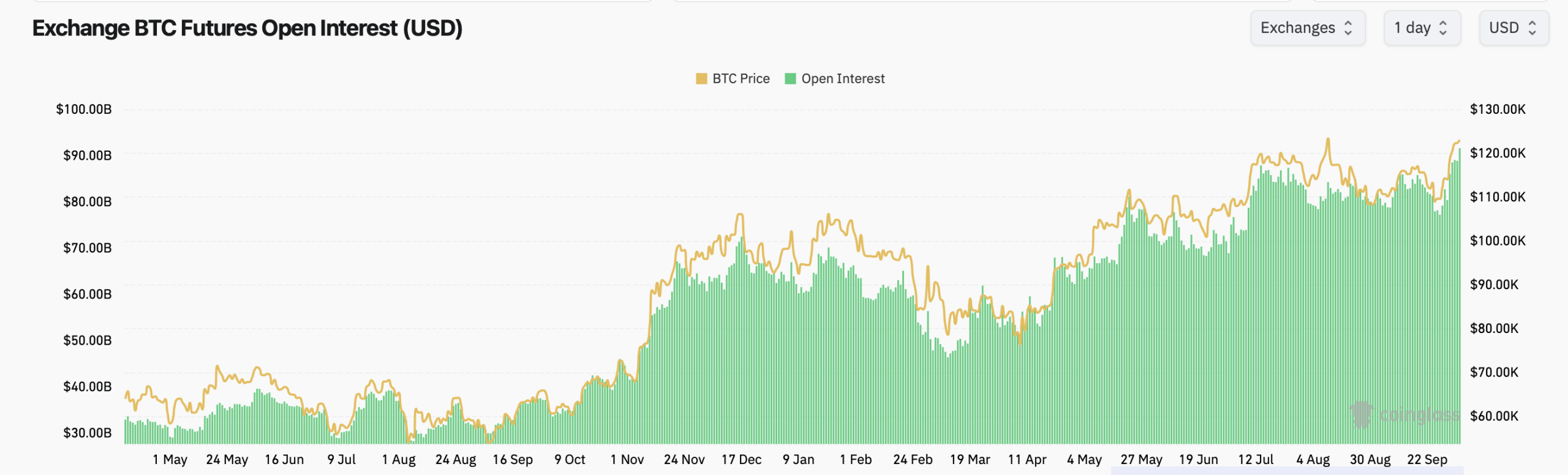 インデックスレベルでは、ビットコインは今週$125,725を突破した後、$123,142に落ち着きましたが、デリバティブの人々はまったく動じませんでした。AggreGate先物のオープンインタレスト(OI)の数値は、$91.59億近くで史上最高に達し、1日の間に2.04%上昇しました。これは、トレーダーが利益を確定する代わりにリスクを追加したことを示しています。翻訳:カジノの明かりは点灯し、チップは高く積まれています。