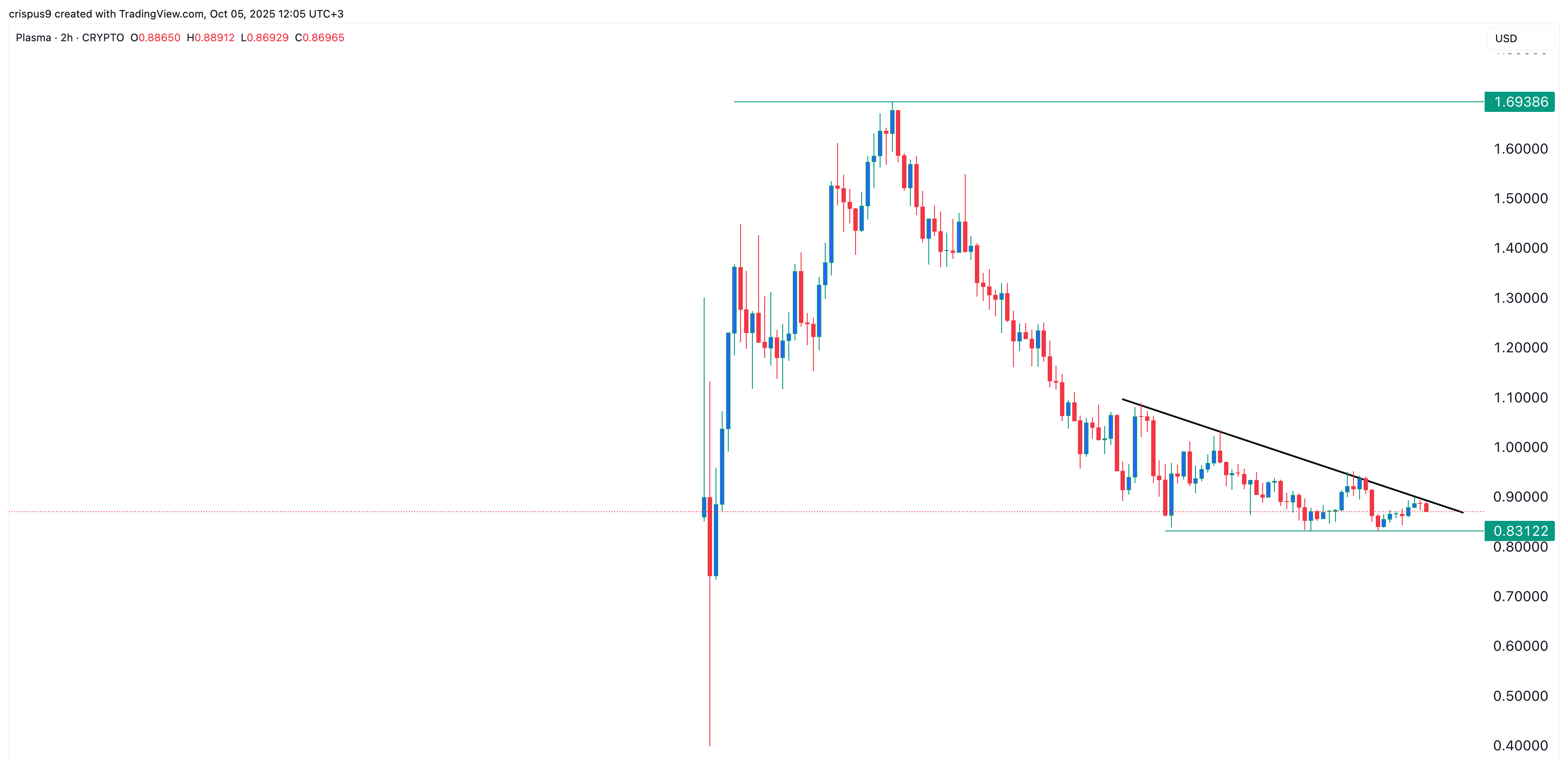 プラズマの価格は最近のエアドロップ後にベアマーケットに入りましたが、その取引と分散型金融における資産は急増しています。概要* Plasmaの急激な価格下降は、オンチェーンのファンダメンタルと市場のセンチメントとの間のギャップが拡大していることを示しています。* ネットワークの活動が急増し、DeFiの預金が急騰し、Chainlinkとの新たなパートナーシップが結ばれたにもかかわらず、エアドロップ後のトークンの売り圧力は、短期的な利益確定と流動性ダイナミクスが強力なプロジェクトのパフォーマンスを上回る可能性があることを浮き彫りにしています。* 今後数週間は、Plasmaの基本が投資家の信頼を安定させ、回復を促すことができるかどうかが試される。プラズマの価格はエコシステムの成長にもかかわらず急落しました---------------------------------------------プラズマ (XPL) トークンは、$1 の重要なサポートレベルを下回り、その後$0.8720の低水準に達しました。今月の最高点からほぼ50%下落しています。プラズマトークンは、そのネットワークの強力なパフォーマンスにもかかわらず、大幅に下落しました。データによると、ネットワーク内の取引数は過去30日間で5200%増加し、2870万件を超えました。この成長により、レイヤー1およびレイヤー2業界で最も速いプレイヤーとなりました。さらにデータが明らかになり、アクティブアドレスの数も急増し、878,600を超えました。これにより、Somnia、Starknet、Avalancheなどの他のチェーンよりも大きくなっています。より多くのデータが示すところによると、Plasmaはロックされた総価値の観点から第5位のチェーンになっています。そのDeFi TVLは$10 億を超え、Ethereum、Solana、特定の取引プラットフォーム、Bitcoinなどの人気チェーンに次ぐものとなっています。PlasmaはCardano、Tron、Suioなどの人気チェーンを追い越しました。さらに、Plasmaはステーブルコイン業界でトップブランドとなり、そのステーブルコインの総市場規模は50.28億ドルを超えました。Plasmaの成長は、ネットワークがChainlinkとのパートナーシップを結んだ後、加速する可能性があります。Chainlinkは現在、公式のオラクルプロバイダーです。したがって、XPLの価格は、エアドロップの受取人がトークンを売り始めるとともに、おそらく暴落したでしょう。これは、新しいエアドロップが行われるたびに一般的に起こる現象です。XPL価格のテクニカル分析----------------------------2時間足のチャートは、Plasmaの価格がエアドロップ後に$1.6938に達したことを示しています。その後、価格は急落し、最低$0.8312に達しました。コインが$0.8312でダブルボトムパターンを形成したため、底を打った兆しがあります。これはテクニカル分析における最も人気のある強気の反転パターンの一つです。それは下降ウェッジパターンを形成しており、これは非常に強気な兆候でもあります。したがって、このトークンは強力な強気ブレイクアウトを持つ可能性が高く、心理的なポイントである$1に達する可能性があります。$0.8312のサポートを下回ると、強気の見方は無効になります。
