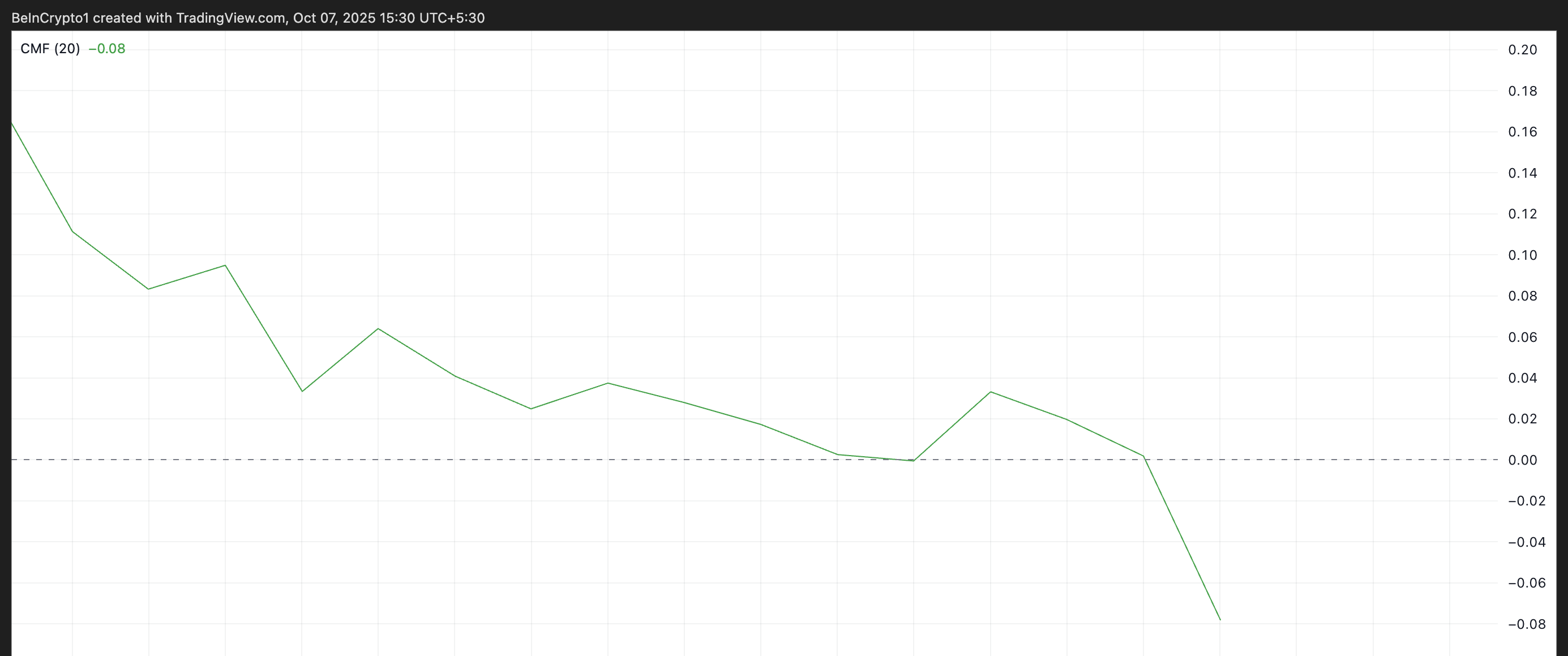 DOGEは過去2週間で二桁の利益を上げている一方で、資本の流入と流出を追跡する重要な指標であるChaikin Money Flow (CMF)が減少し、弱気のダイバージェンスを形成しています。このモメンタム指標は、報道時点で-0.08のゼロラインの下にあります。