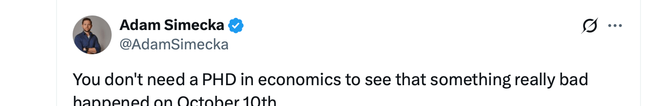 ファンドストラットのトム・リーは今週、このイベントが「市場メーカーを本当に cripled した」と強調し、彼らがオーダーフローを安定させる能力が低下したことを示しました。深い流動性のない市場は、予想よりも早く下落する市場であり、まさにそれが起こりました。市場全体でのロングポジショニングは、下落をさらに悪化させました。