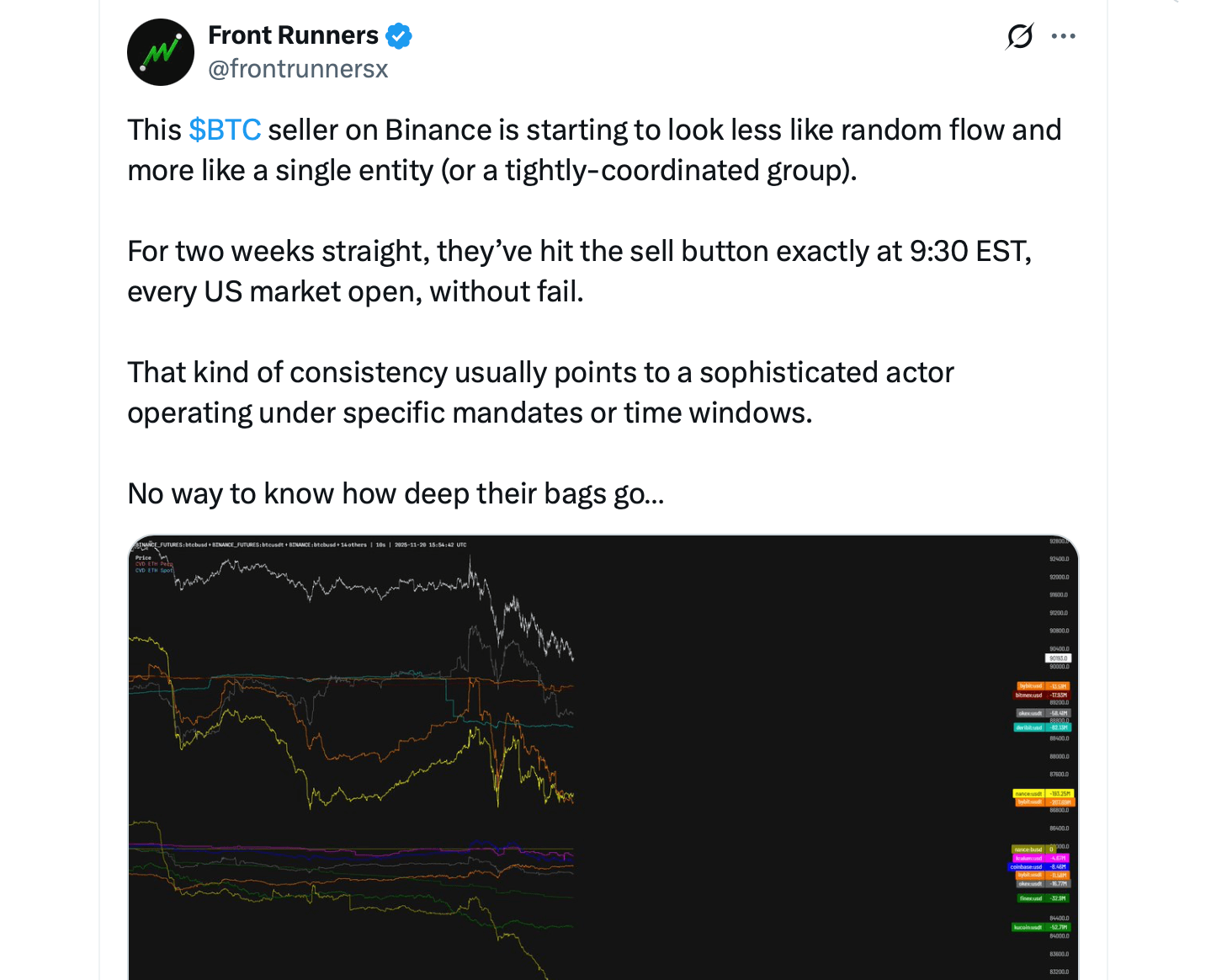 その乖離は、誰か — または複数の企業 — が薄い市場で実行が破損した状態の中でリスクを解消しているという信念を高めています。それはリズムに合っています:同一の売却ウィンドウ、薄い流動性のブレーク、そして通常の反発行動の欠如です。市場崩壊理論の広範なスペクトルに加えて、人工知能(AI)バブルの崩壊、日本の長期債の爆発、トランプの貿易戦争、株式市場の修正、そして米国の景気後退に対する有効な懸念があります。