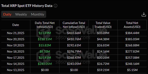 ビットコインとイーサリアムのETFが減少する中、ソラナとXRPのETFは11月21日に無傷の流入ストリークを延ばしました。