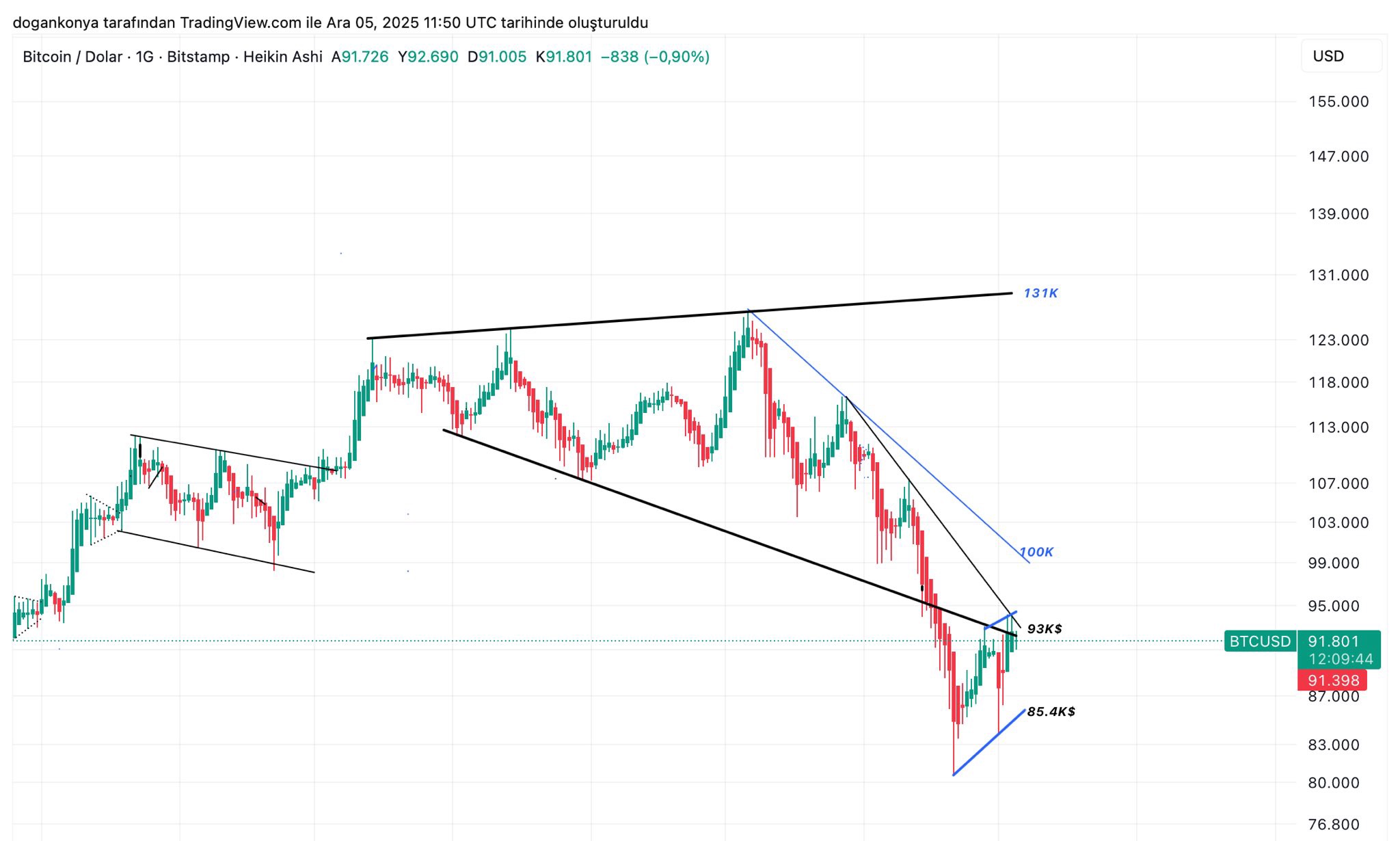 PlanDは12月5日のX投稿で、ビットコイン市場の継続分析のアップデートを提供し、暗号資産のリーダーが設定された価格レンジ内で勢いを増しているようだと述べています。特に、最近の値動きで、ビットコインは$93,000~$131,000の拡大する上昇チャネルの下限を下回り、弱気相場への懸念が高まっています。
