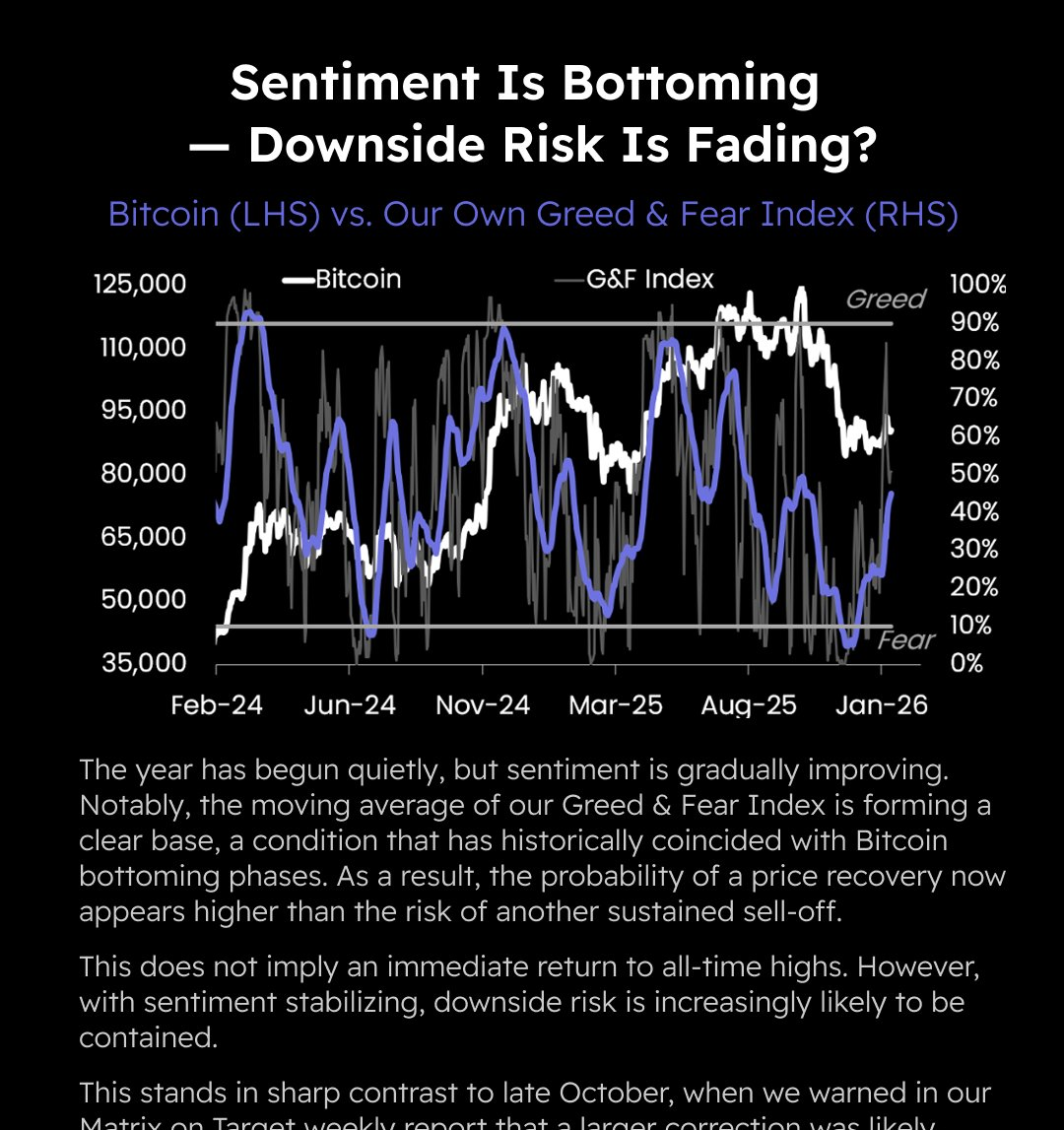 「私たちのGreed & Fear Indexの移動平均は明確な底値を形成しており、これは歴史的にビットコインの底値局面と一致しています」とMatrixportは記しています。