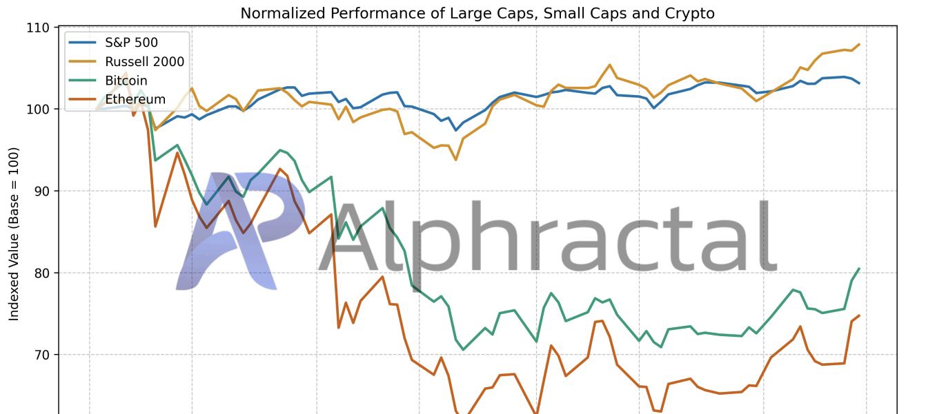 パフォーマンスを資産間で正規化して比較すると、暗号資産の振る舞いはメガキャップ株式よりも、経済感応度の高い小型株に近いことがわかる。長期的には、ビットコインはS&P 500よりもラッセル2000により密接に追随しており、暗号資産が成長条件に反応し、防御的資本フローよりも成長志向の動きに近いことを裏付けている。