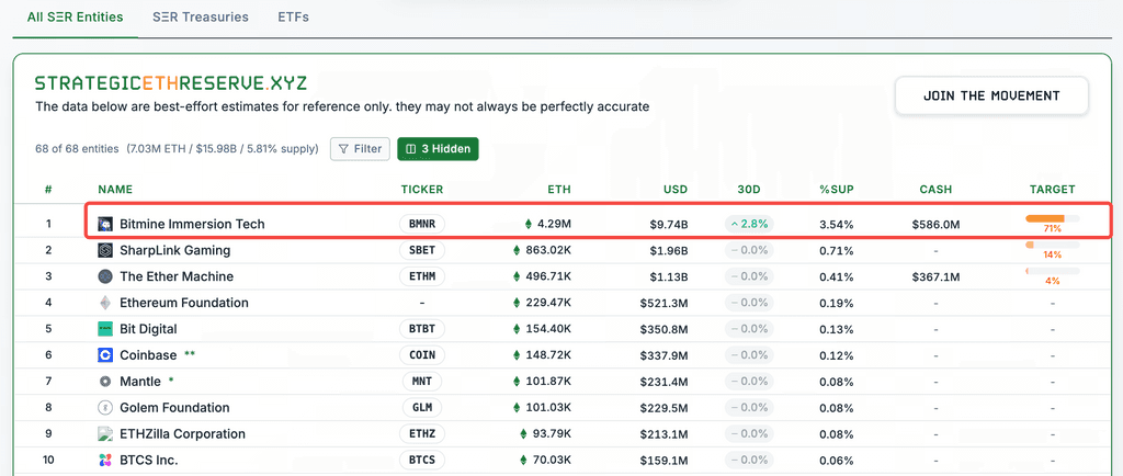 継続的な買い増しにより、BitMineのイーサリアム保有量は増加しています。Strategic ETH Reserveのデータによると、同社は現在約429万ETHを保有しており、これは世界最大の企業イーサリアム保有者となっています。この保有量は、イーサリアムの流通総量の約3.5%に相当し、同社は最終的に流通量の5%をコントロールすることを目標としています。