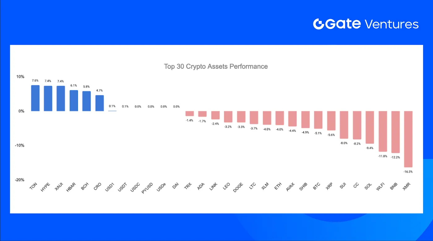 時価総額上位30の暗号資産は平均2.8%の下落となり、TON、HYPE、XAUtがリードしています。