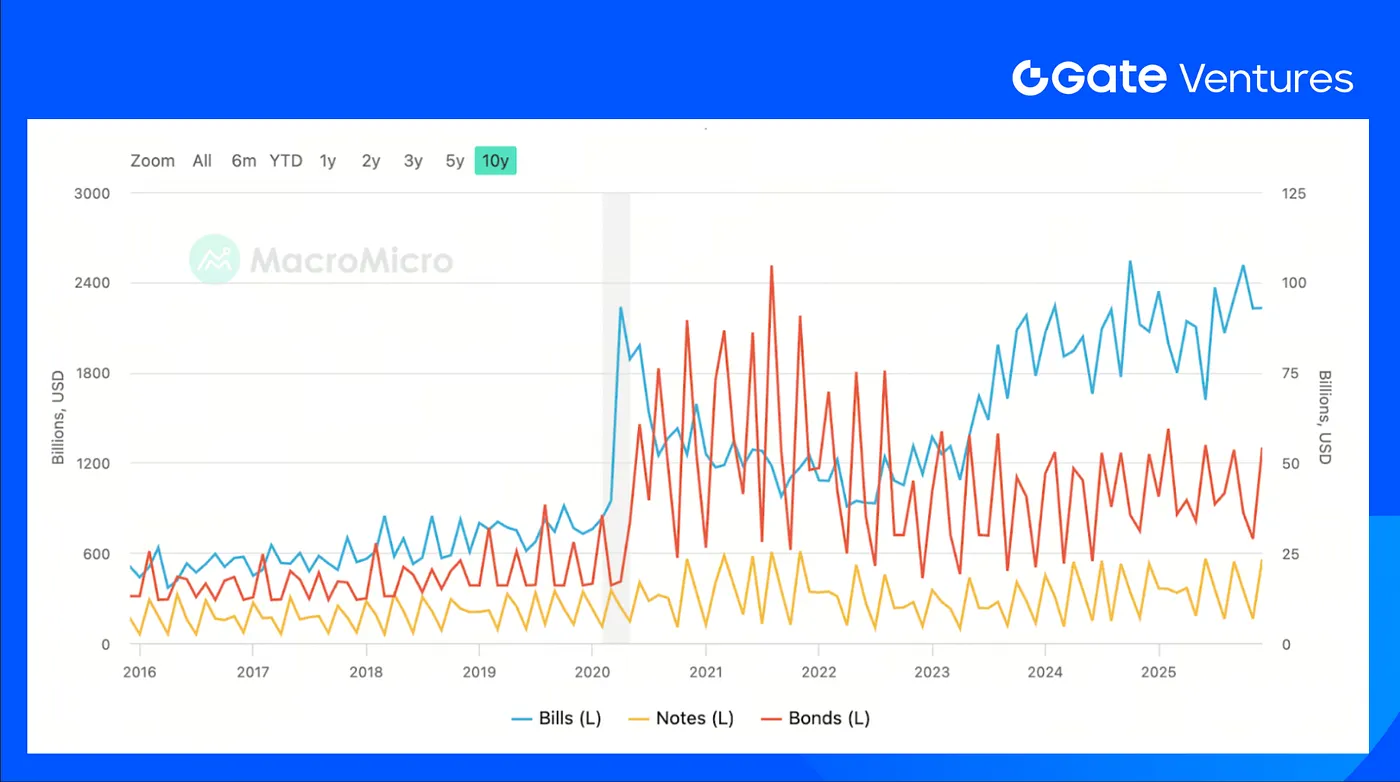 トランプ氏は、債務コストを下げるためにFRBに利下げを強く促したいと考えています。もしウォーシュがバランスシート拡大を拒否すれば、FRBは財政赤字の支払いを行わず、財政と金融の拡張的調整は崩壊します。妥協案としては、FRBがより大幅な利下げを行い、米国財務省が短期国債を増発して債務構造を調整することが考えられます。利下げにより短期金利が低下し、財務省は資金調達コストを削減し、縮小不足による長期金利の上昇を回避できます。実際、米国財務省はすでに短期国債の発行比率を増やし始めており、今後もさらなる調整余地があります。