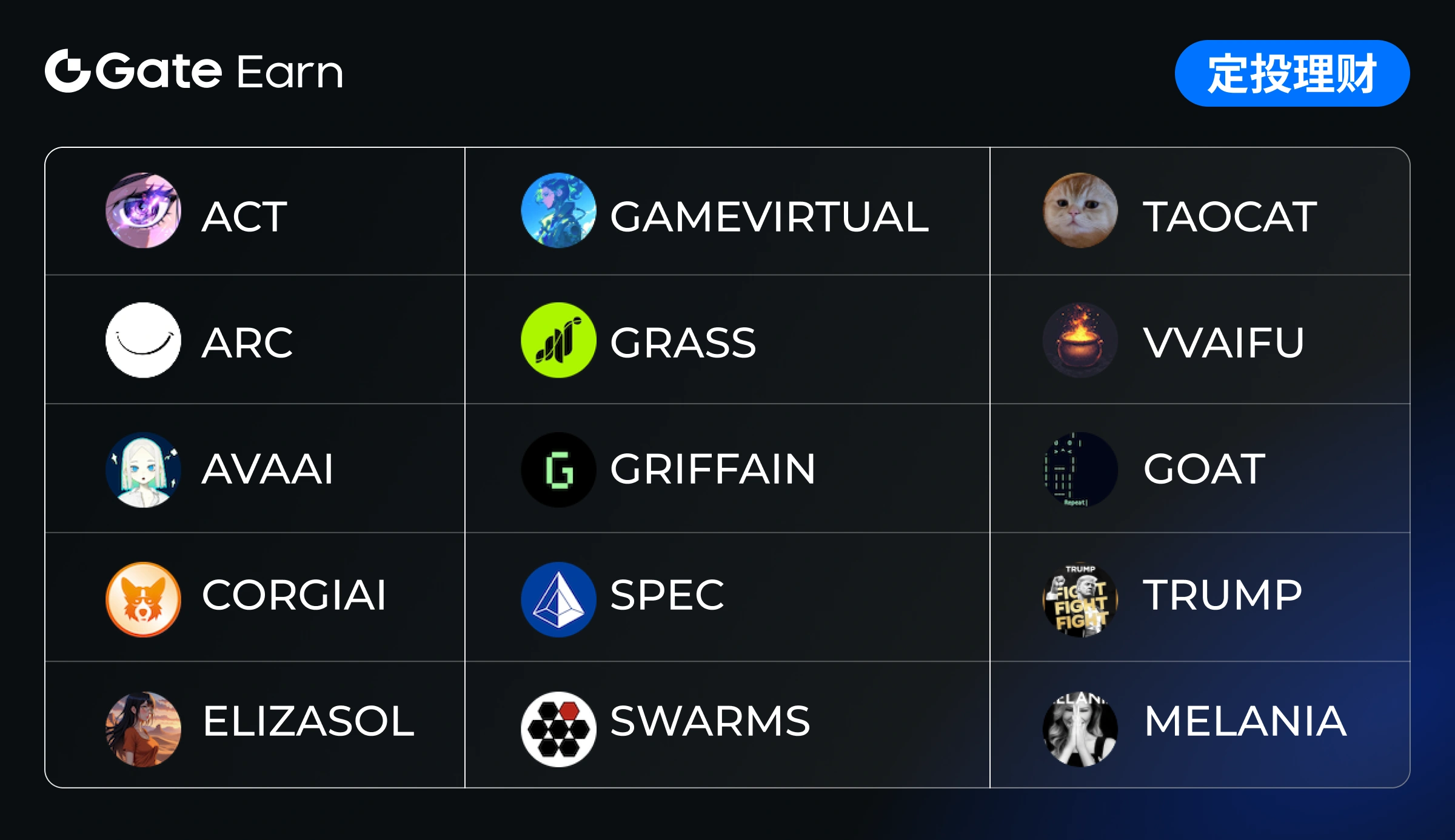 Gate.io 自動投資金融已支援AI Agent ゾーントークン、 $TRUMP と $MELANIA、合計15種類の人気トークン。 目まぐるしく変化する暗号市場では、堅牢な投資戦略が特に重要 Gate.io、自動投資により、より柔軟に財務を管理し、長期的な資産成長を達成することができます。