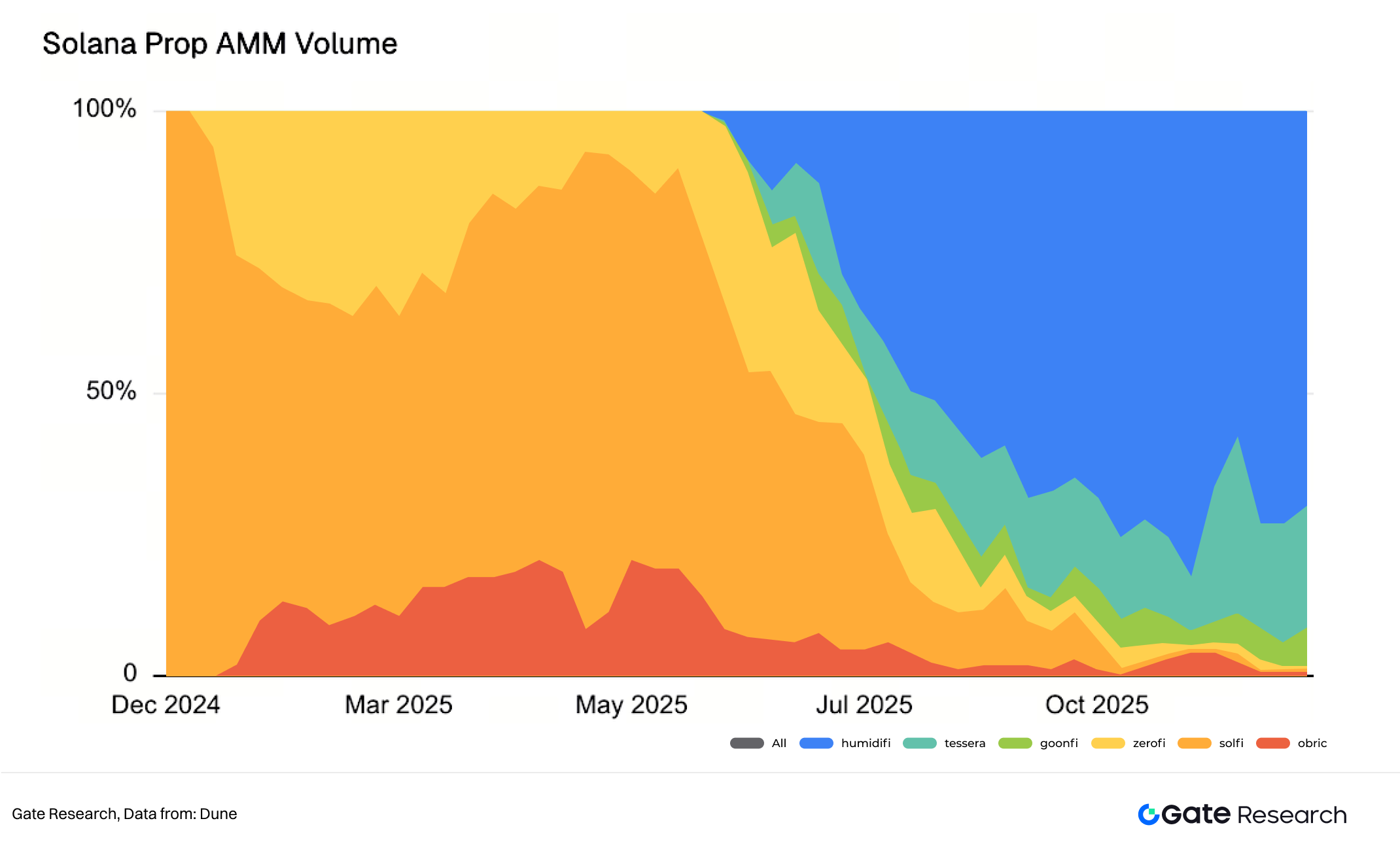 Prop AMM — це ончейн-майданчики, де ліквідність контролюється професійними маркетмейкерами, алгоритми ціноутворення не є публічними (або частково обчислюються офчейн), і зазвичай немає фронтенду. Через закритість їх називають Dark AMM або Private Market Makers. Основні Prop AMM на Solana: HumidiFi, Tessera V, GoonFi, ZeroFi, SolFi.