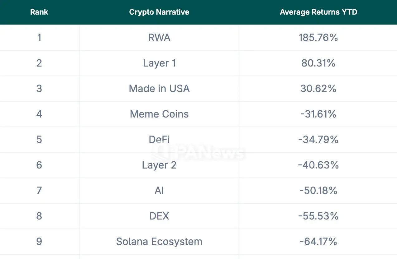 According to a recent report released on December 24, only three crypto narratives were profitable in 2025. Crypto tokens linked to Real-World Assets (RWA) have recorded returns of about 185.7% year-to-date (YTD).