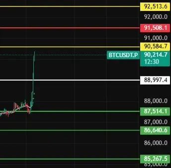 Specific Analysis of Each Coin (Levels are for reference only) BTC Key Level: 90,500 (stability above this supports long positions) Support Levels: 89,000 → 87,500 → 86,500 Resistance Zones: 91,300 → 92,500 → 94,600