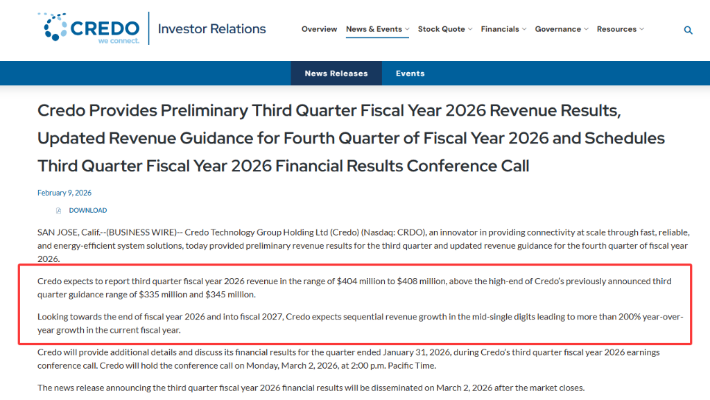 On Monday, February 9, Credo released preliminary financial results for Q3 FY2026 (ending January 31, 2026) after the U.S. stock market close, and updated its full-year outlook.