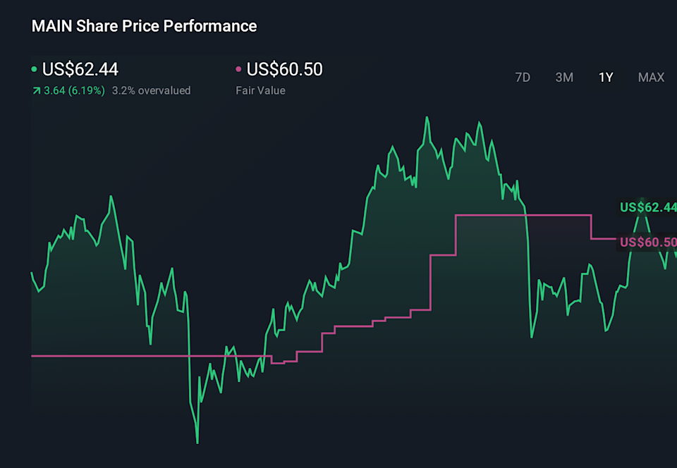 Main Street Capital’s latest valuation update keeps the fair value anchor steady at US$63.43 per share, while making small tweaks to the discount rate and revenue growth assumptions that sit behind the price target. These shifts largely reflect a fresh balance between optimism and caution among analysts rather than a single new headline event. Stay tuned as we break down what is driving these moving pieces and how you can keep on top of the narrative as it evolves.