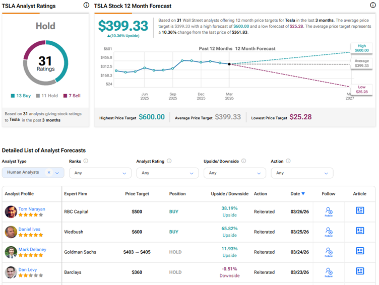 Wall Street is divided on Tesla stock, with a Hold consensus rating based on 13 Buys, 11 Holds, and seven Sell recommendations. The average TSLA stock price target of $399.33 indicates 10.4% upside potential. TSLA stock has declined more than 19% year-to-date.