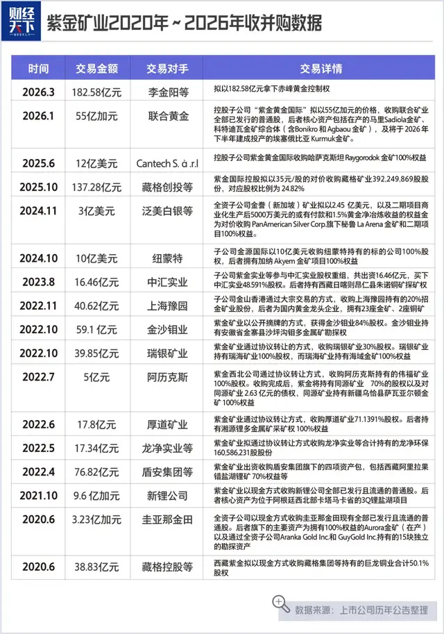 Adding the spending of 18.258 billion yuan for this acquisition alone, in less than one quarter of 2026, Zijin Mining plans to allocate more than 46.2 billion yuan for acquisitions. According to incomplete statistics, from 2020 to 2025, the money Zijin Mining spent on buying mines and purchasing equity at home and abroad totaled 65 billion yuan. If you include these two new acquisitions in 2026, then since 2020 the total amount Zijin Mining has spent on acquisitions will reach 1100 billion yuan.