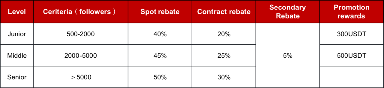 Inviters who have passed the Ambassador program are required to participate in the quarterly assessment as required to maintain or upgrade according to the assessment results. Those who are successfully promoted will receive a reward of up to 500 USDT. For more information on assessment and promotion criteria, please contact us for help. (