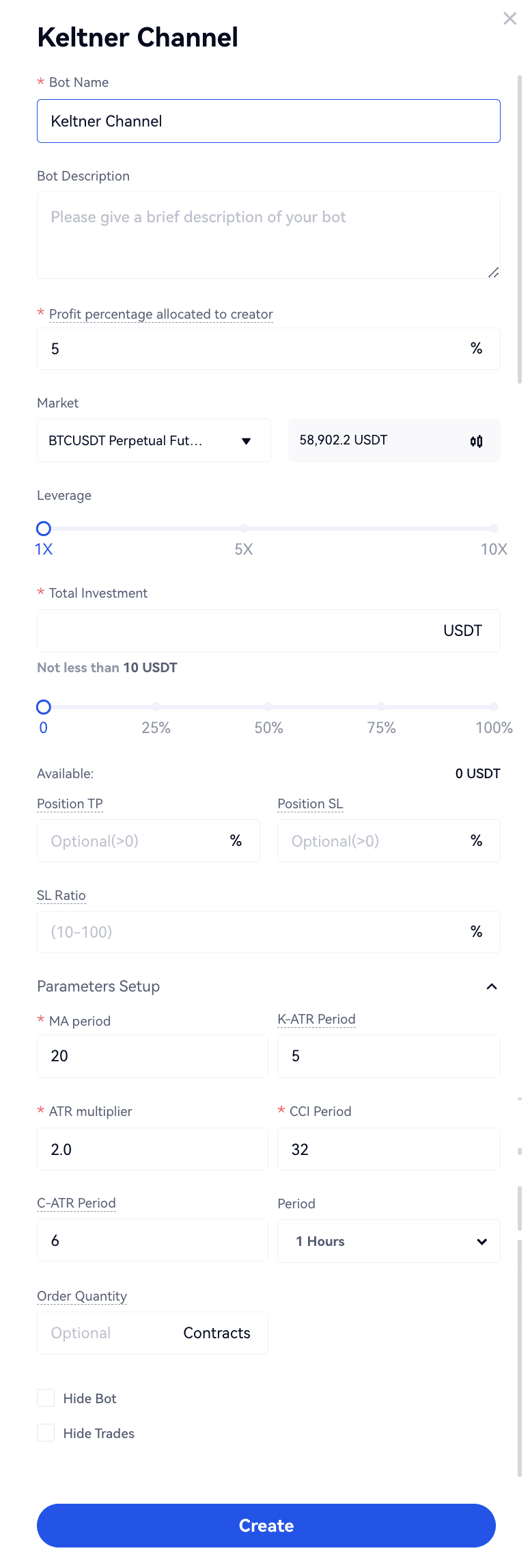 Bots - Criar um Bot - Futuros - CTA - Keltner Channel - Backtest - Configurar Parâmetros - Criar