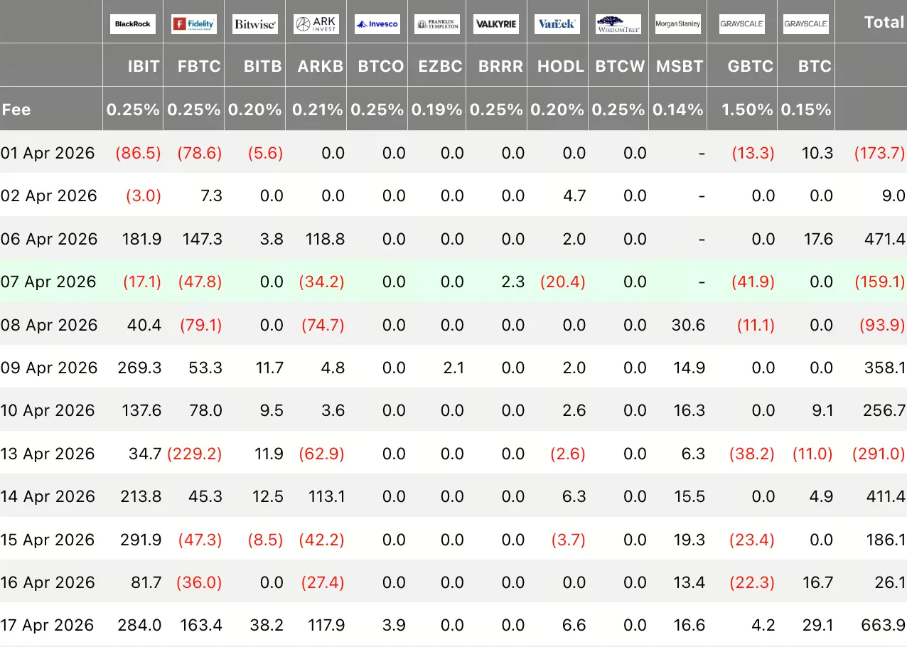O IBIT atrai continuamente alocações de investidores institucionais graças ao endosso da maior gestora de ativos do mundo, a uma ampla rede de distribuição institucional e a uma profundidade de liquidez abundante. Em 17 de abril, a entrada líquida total histórica do IBIT chegou a US$ 64,63 bilhões, muito à frente de todos os ETFs de bitcoin à vista.