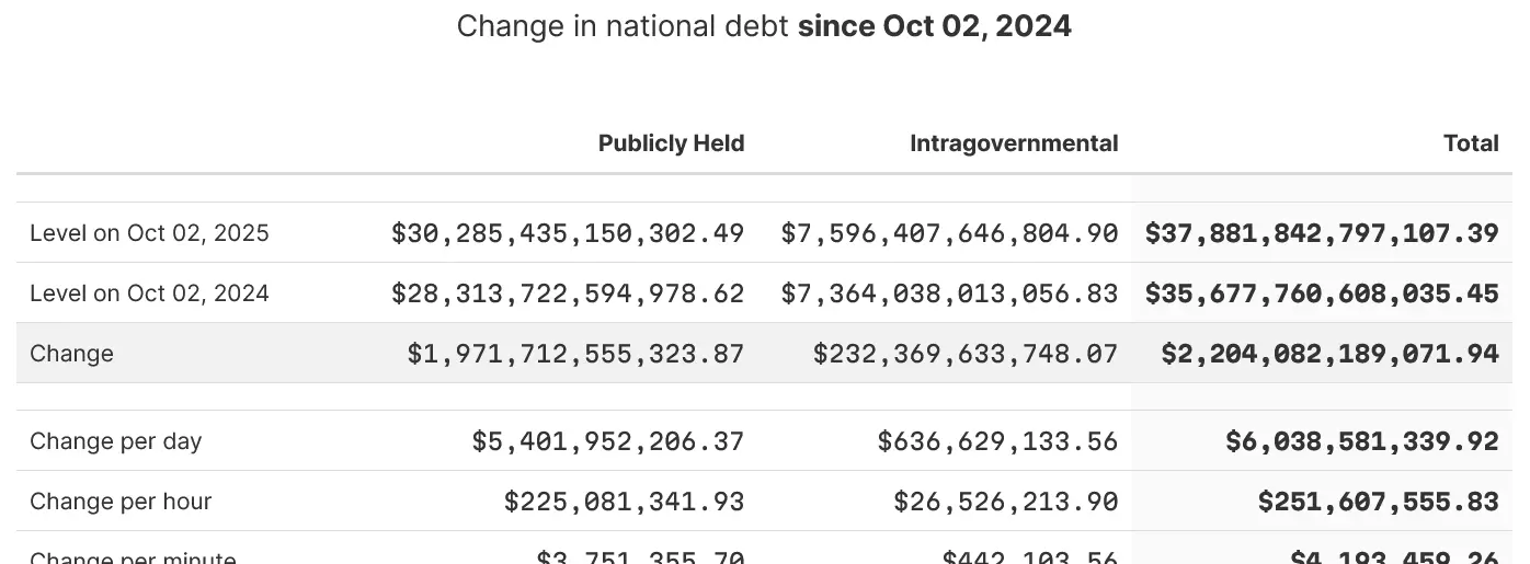 A dívida nacional da América, atualmente de 37,9 trilhões de dólares, está a aumentar em 69.890 dólares por segundo --- ou quase 4,2 milhões de dólares por minuto --- ao longo do último ano, de acordo com o painel de dívida do Comitê Económico Conjunto do Congresso dos EUA (JEC).