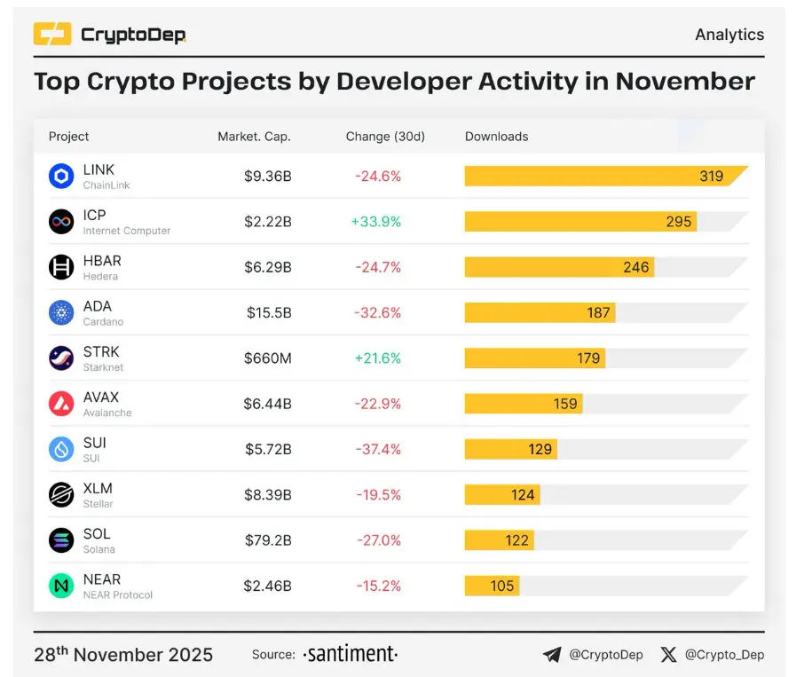 Os dados mais recentes de novembro mostram uma mudança clara no nível de participação das equipes de desenvolvimento nos grandes ecossistemas de blockchain, com Chainlink, Internet Computer e Hedera ocupando respectivamente as três posições principais. A atividade de desenvolvimento é medida pelo número de eventos no GitHub em repositórios públicos – um indicador confiável que reflete a força a longo prazo do projeto.
