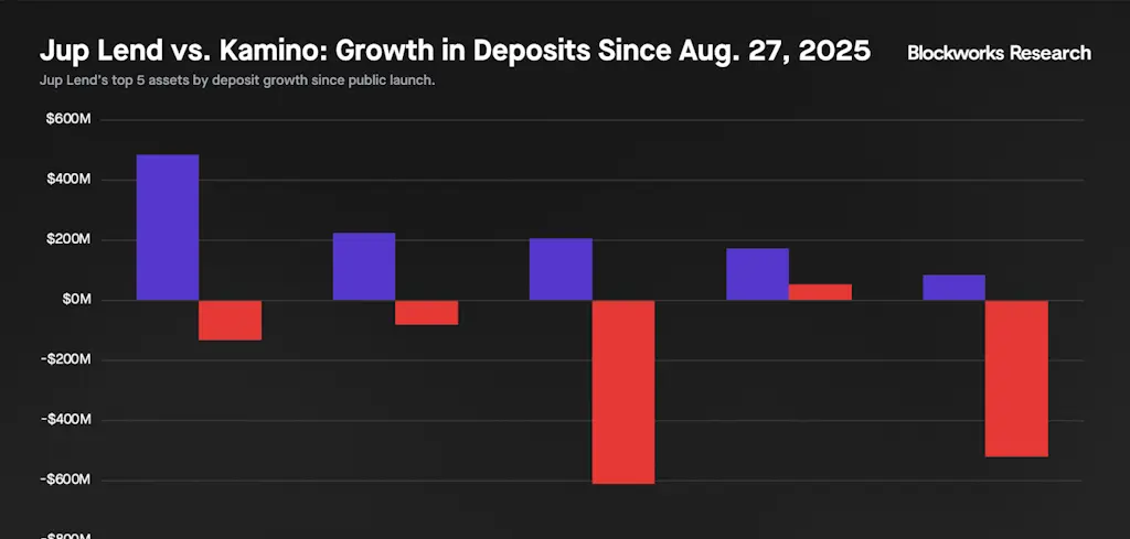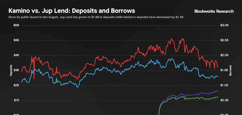 Desde o seu lançamento no final de agosto, a Jup Lend cresceu até $1,6 mil milhões em depósitos e $610 milhões em empréstimos. Os depósitos e empréstimos da Kamino diminuíram em $1,3 mil milhões (-28%) e $460 milhões (-26%), respetivamente, no mesmo período.