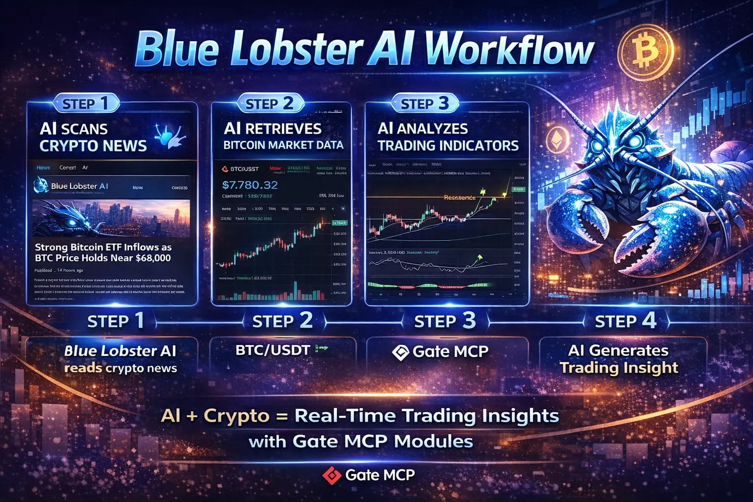 O Blue Lobster AI atua como um assistente de negociação de criptomoedas que monitora continuamente o mercado usando múltiplos módulos Gate MCP.