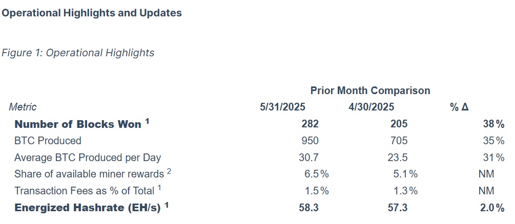 MARA Активы выпустили новый отчет на этой неделе, охватывающий их Биткойн (BTC) производительность добычи за май 2025 года. Согласно компании, в этот период был достигнут новый рубеж, произведя рекордные 950 BTC из 282 блоков, которые они выиграли.