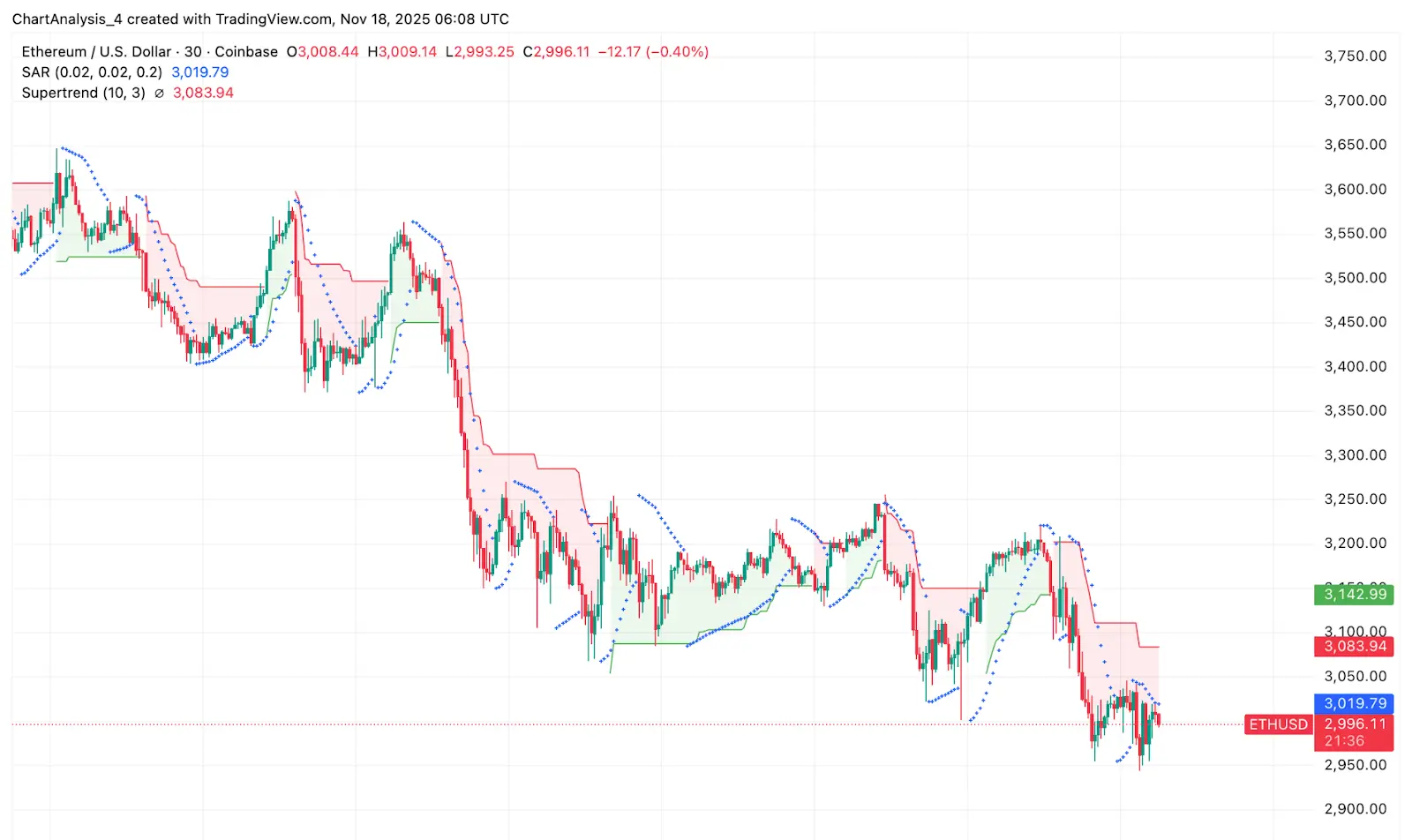 Краткосрочные графики показывают, что ETH пытается стабилизироваться выше $2,980, но восстановление остается поверхностным. На 30-минутном таймфрейме Supertrend находится на уровне $3,083, образуя потолок, который отклонил каждый микровсплеск.